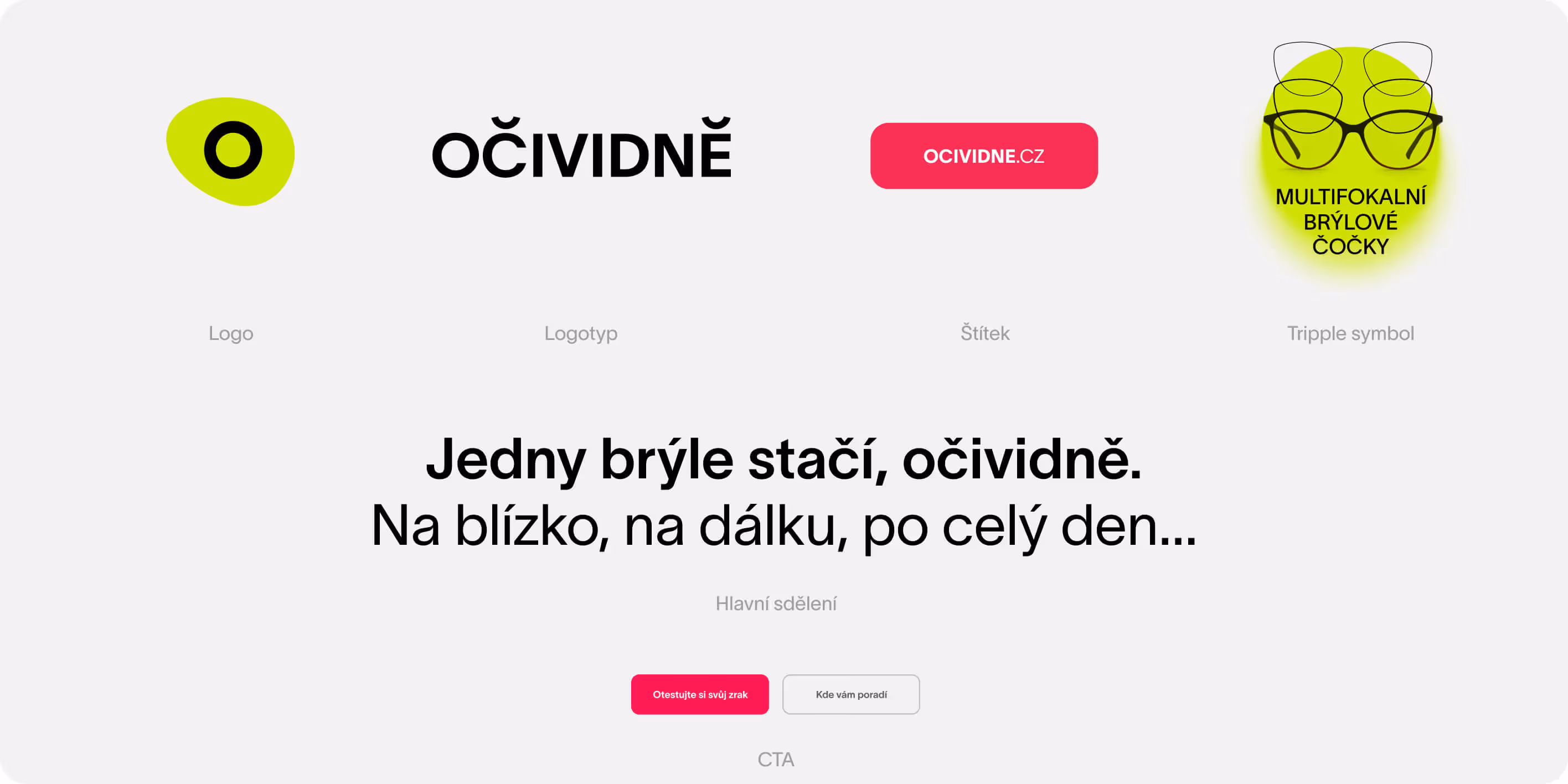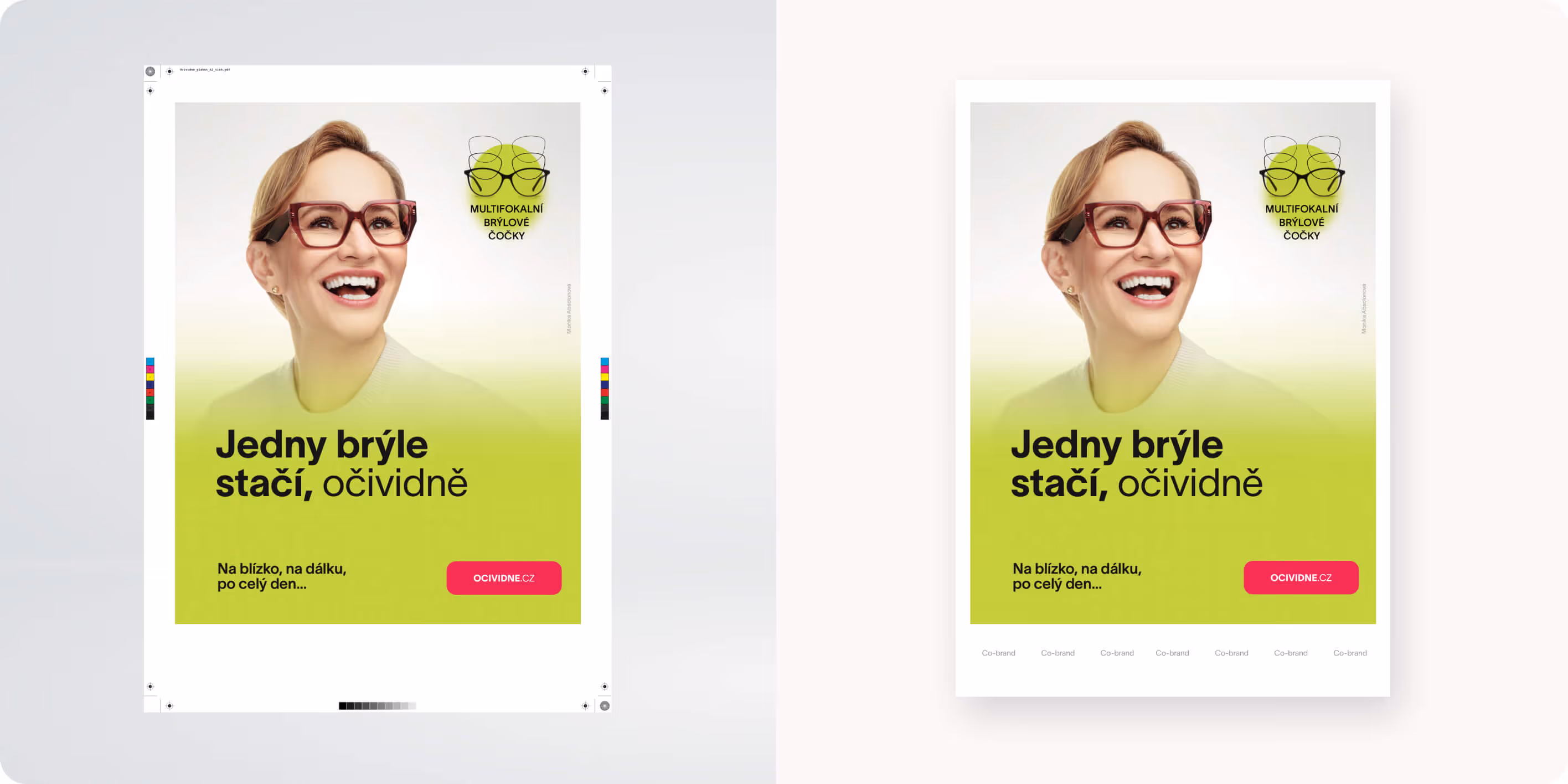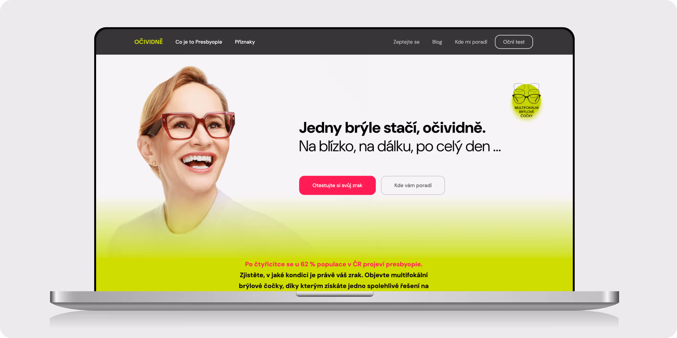 Základem celé komunikace se stal jednoduchý, ale výrazný claim „Jedny brýle stačí, očividně“, který jasně pojmenovává hlavní benefit multifokálních čoček. Na něj jsme navázali svěží vizuální identitou s výraznou barevností, typografií a charakteristickými grafickými prvky.